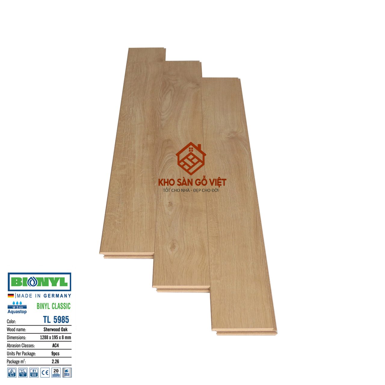 Sàn gỗ Binyl Class 8mm TL5985 là dòng sản phẩm nhập khẩu chính hãng từ Đức, được sản xuất trên dây chuyền tiên tiến với công nghệ O.R.C.A độc quyền. Với độ dày 8mm, kích thước tiêu chuẩn 1285 x 192mm và bề mặt chống trầy AC4, mẫu TL5985 mang đến sự cân bằng giữa độ bền, tính thẩm mỹ và giá trị sử dụng lâu dài. Thiết kế vân gỗ tự nhiên, màu sắc hiện đại giúp sản phẩm dễ dàng phối hợp với nhiều phong cách nội thất khác nhau, từ gia đình cho tới văn phòng.