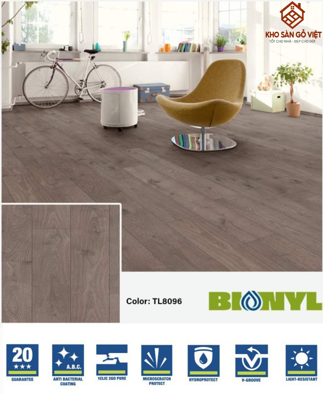 Sàn gỗ Binyl Class 8mm TL8096 là một trong những mã màu nổi bật trong bộ sưu tập Binyl nhập khẩu từ Đức, được phân phối chính hãng tại Việt Nam bởi Kho Sàn Gỗ Việt. Với độ dày 8mm, kích thước 1285 x 192mm cùng cấp chống trầy AC4, sản phẩm vừa đáp ứng nhu cầu sử dụng lâu dài vừa mang lại vẻ đẹp tinh tế cho không gian. Mã TL8096 có tông màu gỗ hiện đại, vân gỗ tự nhiên sang trọng, dễ dàng phối hợp với nhiều phong cách nội thất khác nhau.