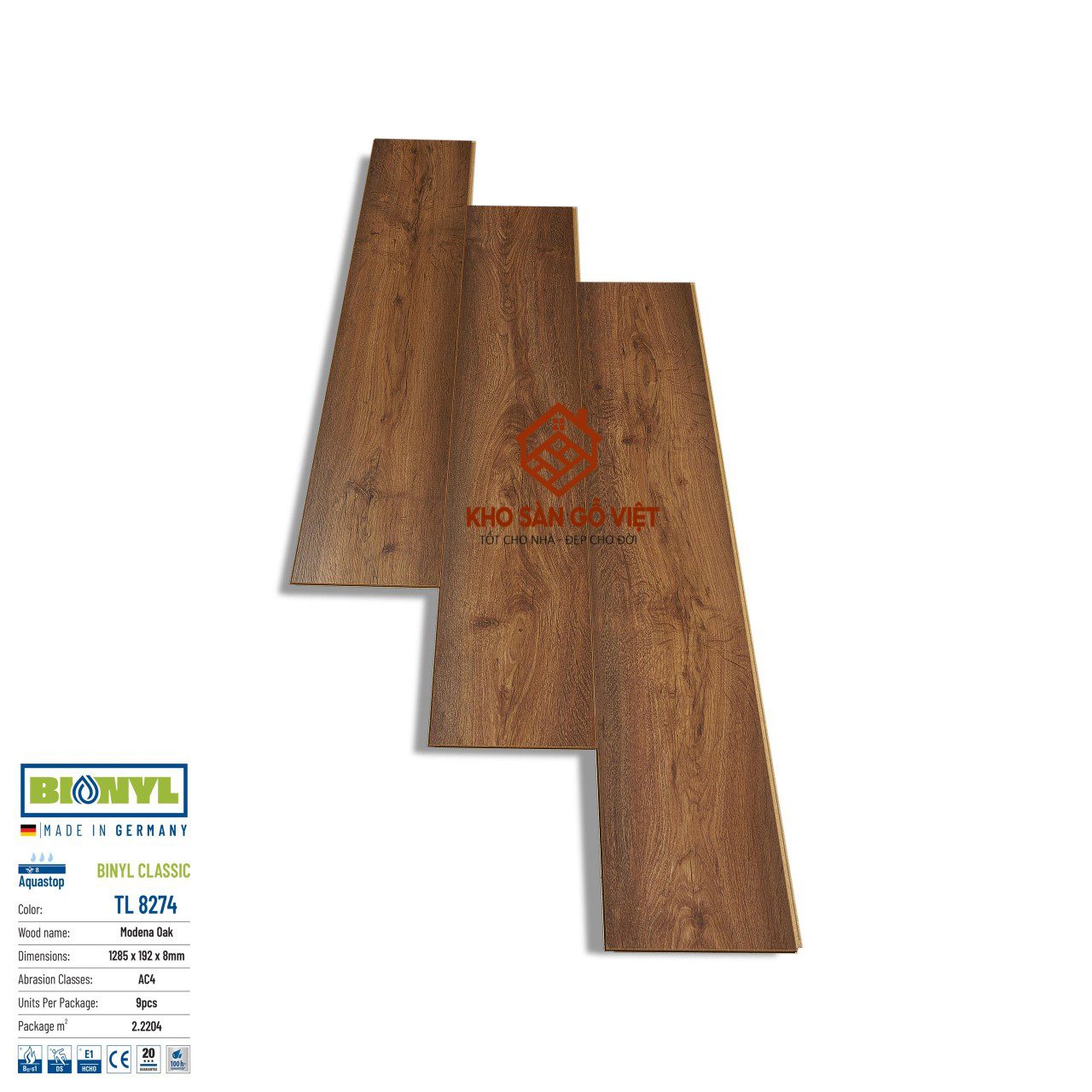 Sàn gỗ Binyl Class 8mm TL8274 là sản phẩm nhập khẩu chính hãng từ Đức, được sản xuất với công nghệ O.R.C.A chống thấm độc quyền. Với kích thước tiêu chuẩn 1285 x 192 x 8mm, cấp chống trầy AC4 và bề mặt vân gỗ tự nhiên, TL8274 mang lại sự hài hòa giữa độ bền, tính thẩm mỹ và an toàn sức khỏe. Màu sắc hiện đại, thiết kế tinh tế giúp mẫu sàn này phù hợp cho nhiều không gian nội thất, từ gia đình đến văn phòng.