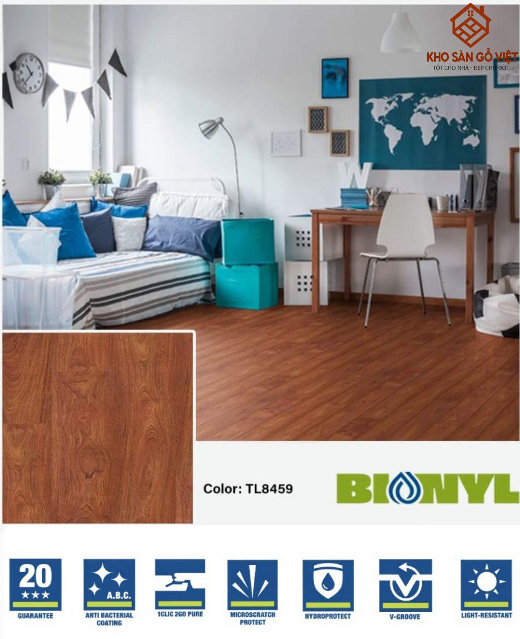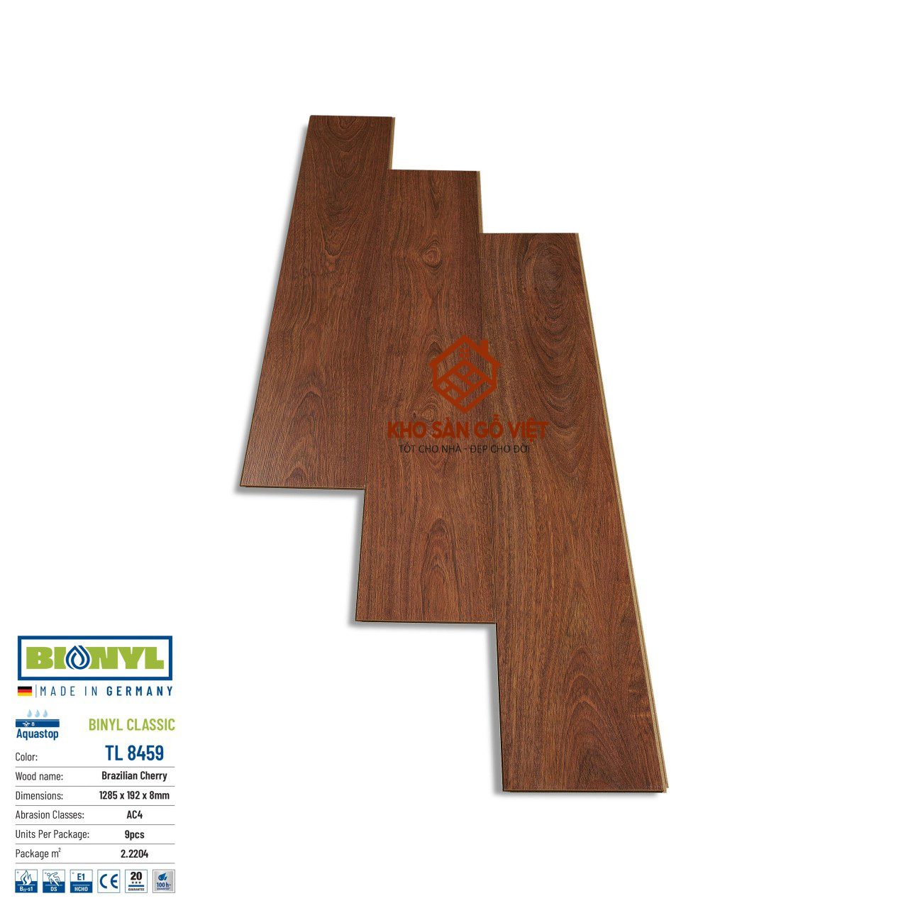 Sàn gỗ Binyl Class 8mm TL8459 là dòng sản phẩm cao cấp nhập khẩu từ Đức, được phân phối chính hãng tại Việt Nam bởi Kho Sàn Gỗ Việt. Với độ dày 8mm, kích thước tiêu chuẩn 1285 x 192mm, chống trầy AC4 và khả năng chịu nước lên đến 72h, mẫu TL8459 là lựa chọn lý tưởng cho các không gian sống hiện đại. Sản phẩm có tông màu gỗ trung tính, vân gỗ tự nhiên sắc nét, dễ dàng phối hợp với nhiều phong cách nội thất khác nhau.