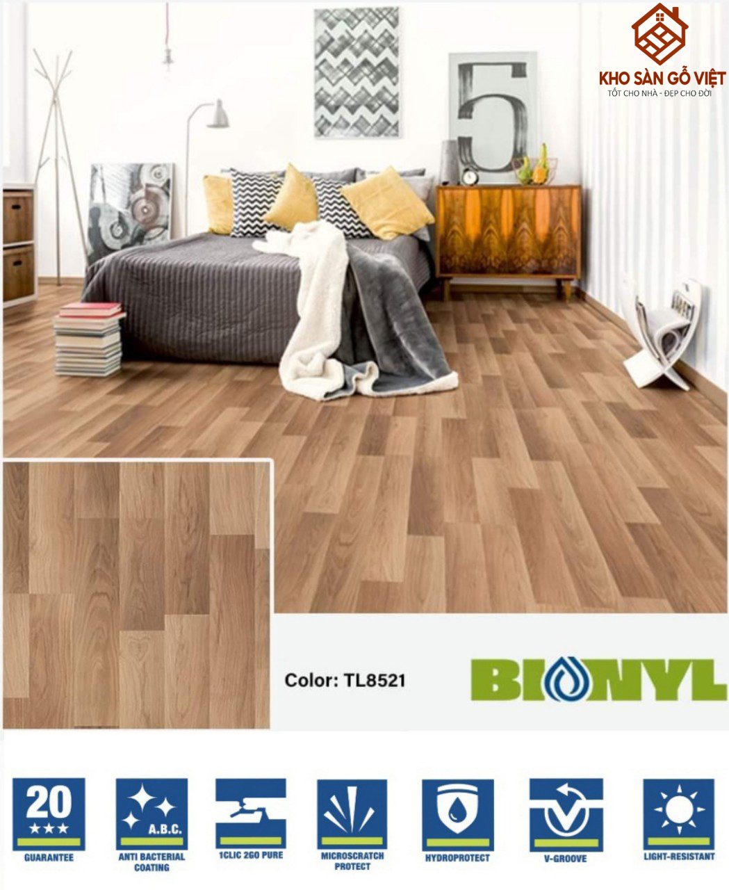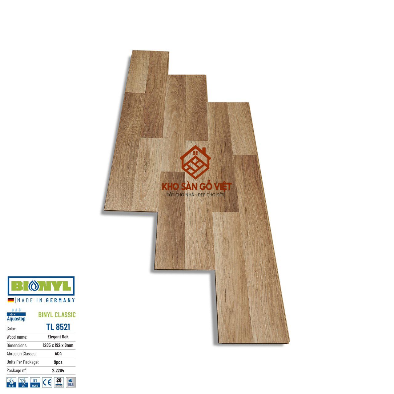 Sàn gỗ Binyl Class 8mm TL8521 là sản phẩm nhập khẩu từ Đức, thuộc dòng sàn công nghiệp cao cấp với công nghệ O.R.C.A chống thấm độc quyền. Mẫu TL8521 có độ dày 8mm, kích thước 1285 x 192mm, cấp chống trầy AC4, bề mặt vân gỗ tinh tế mang hơi thở hiện đại, phù hợp nhiều phong cách nội thất. Đây là lựa chọn lý tưởng cho gia đình và văn phòng nhờ khả năng bền đẹp theo thời gian, an toàn cho sức khỏe và dễ dàng vệ sinh.