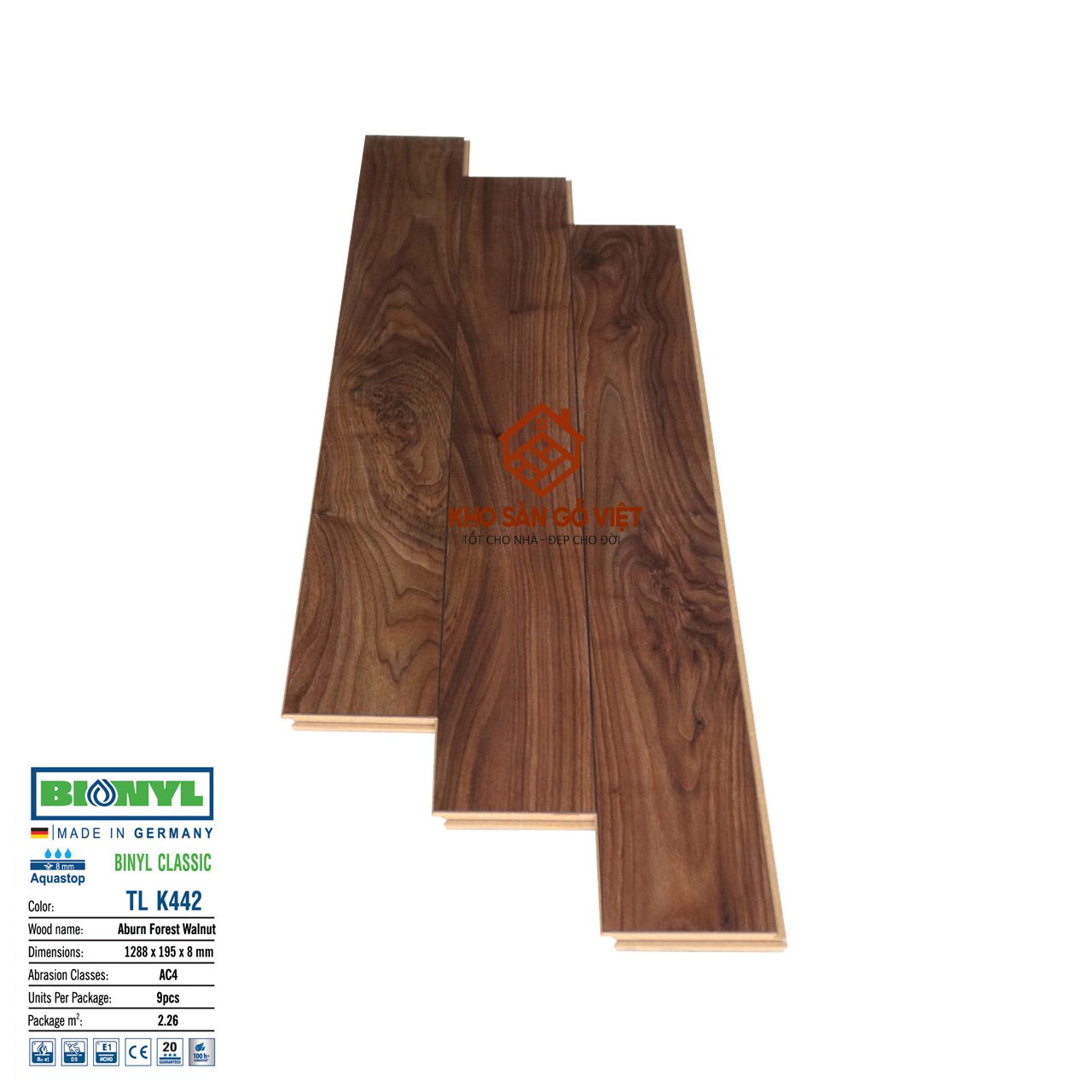 Sàn gỗ Binyl Class 8mm TLK442 là sản phẩm cao cấp nhập khẩu trực tiếp từ Đức, nổi bật với công nghệ O.R.C.A chống thấm độc quyền. Với kích thước tiêu chuẩn 1288 x 192 x 8mm, bề mặt chống trầy AC4 và lớp phủ vân gỗ tinh tế, TLK442 mang đến sự kết hợp hoàn hảo giữa độ bền, tính thẩm mỹ và sự an toàn cho sức khỏe. Mẫu sàn này sở hữu tông màu hiện đại, hài hòa, dễ dàng ứng dụng cho nhiều phong cách nội thất khác nhau.
