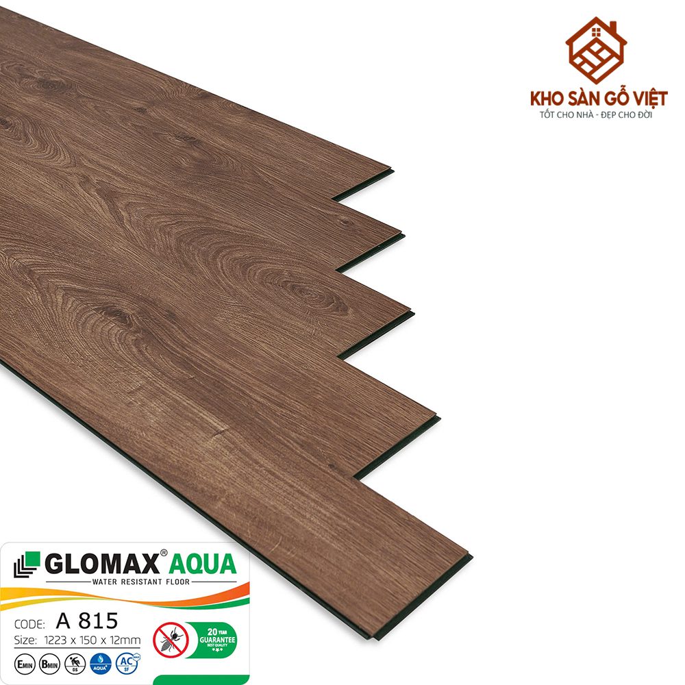 Sàn gỗ Glomax Aqua 12mm A 815 là dòng sàn công nghiệp cao cấp thuộc bộ sưu tập Glomax Aqua được Kho Sàn Gỗ Việt phân phối chính hãng. Sản phẩm nổi bật với gam nâu ấm tự nhiên, vân gỗ chân thật, mang lại cảm giác gần gũi, sang trọng và phù hợp với nhiều phong cách nội thất khác nhau.