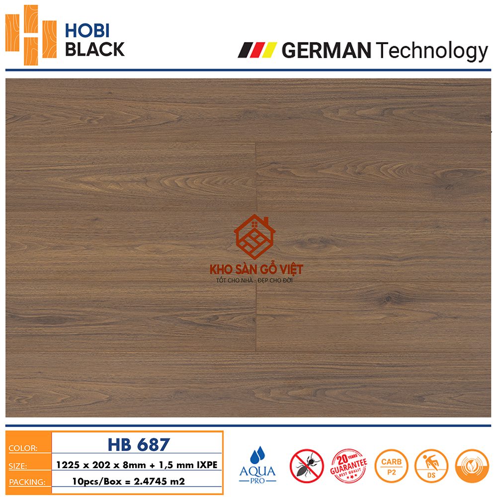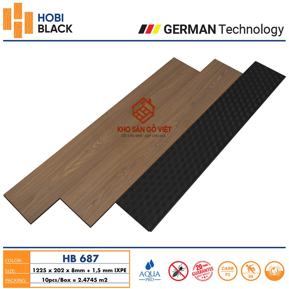 - Cốt gỗ HDF mật độ cao: Được sản xuất trên dây chuyền công nghệ Đức, với lõi gỗ HDF có mật độ cao, giúp tăng cường độ bền và khả năng chịu lực.