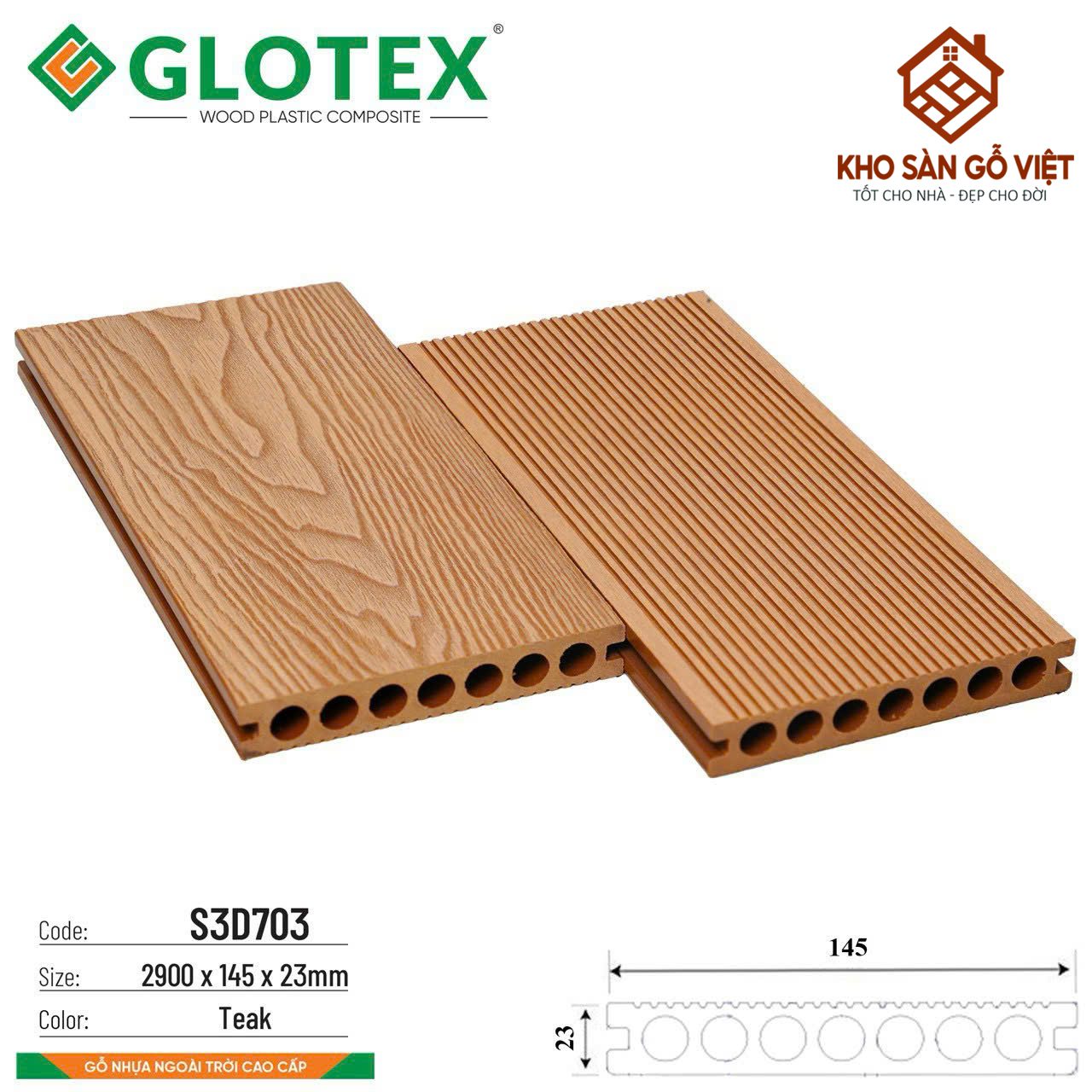 Kho Sàn Gỗ Việt là đơn vị phân phối chính hãng các sản phẩm gỗ nhựa ngoài trời Glotex, trong đó S3D703 màu Teak là mẫu được nhiều khách hàng lựa chọn nhờ màu sắc tự nhiên và độ bền cao.
