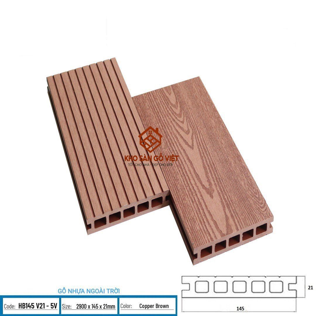 Sàn gỗ nhựa Hobi Wood HB145 V21-5V (Copper Brown) được sản xuất theo công nghệ hiện đại, là lựa chọn lý tưởng cho các hạng mục ngoài trời cần độ bền cao và tính thẩm mỹ sang trọng.