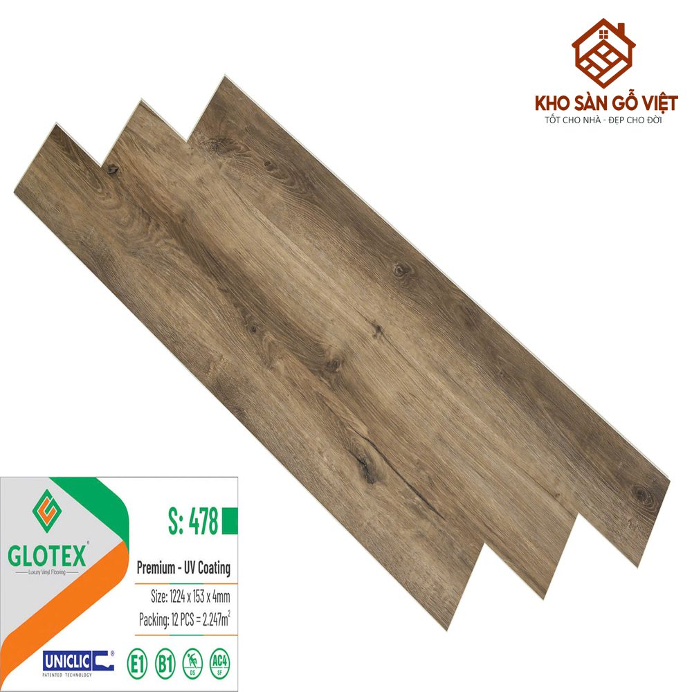 Kho Sàn Gỗ Việt chuyên cung cấp và phân phối sàn Glotex S478 chính hãng cùng dịch vụ chuyên nghiệp: tư vấn chọn mẫu – đo đạc tận nơi – thi công tận nơi nhanh chóng, chuẩn kỹ thuật. Cam kết sản phẩm chính hãng, bảo hành đầy đủ, hỗ trợ kỹ thuật trọn đời. Ngoài Glotex, showroom còn phân phối nhiều thương hiệu nổi tiếng khác như Wilson, Inovar, Galamax, Dongwha, Robina… đáp ứng đa dạng nhu cầu lắp đặt cho nhà ở, văn phòng và công trình thương mại trên toàn quốc, mang đến giải pháp sàn hoàn thiện – đẹp – bền – an toàn cho mọi không gian