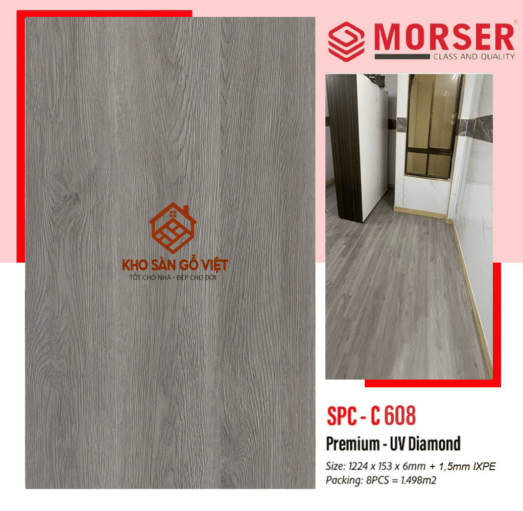 Sàn nhựa hèm khóa Morser 6mm C608 SPC siêu bền, chống nước tuyệt đối, chống trầy xước AC5, chịu lực tốt, lắp đặt nhanh gọn và an toàn cho sức khỏe.