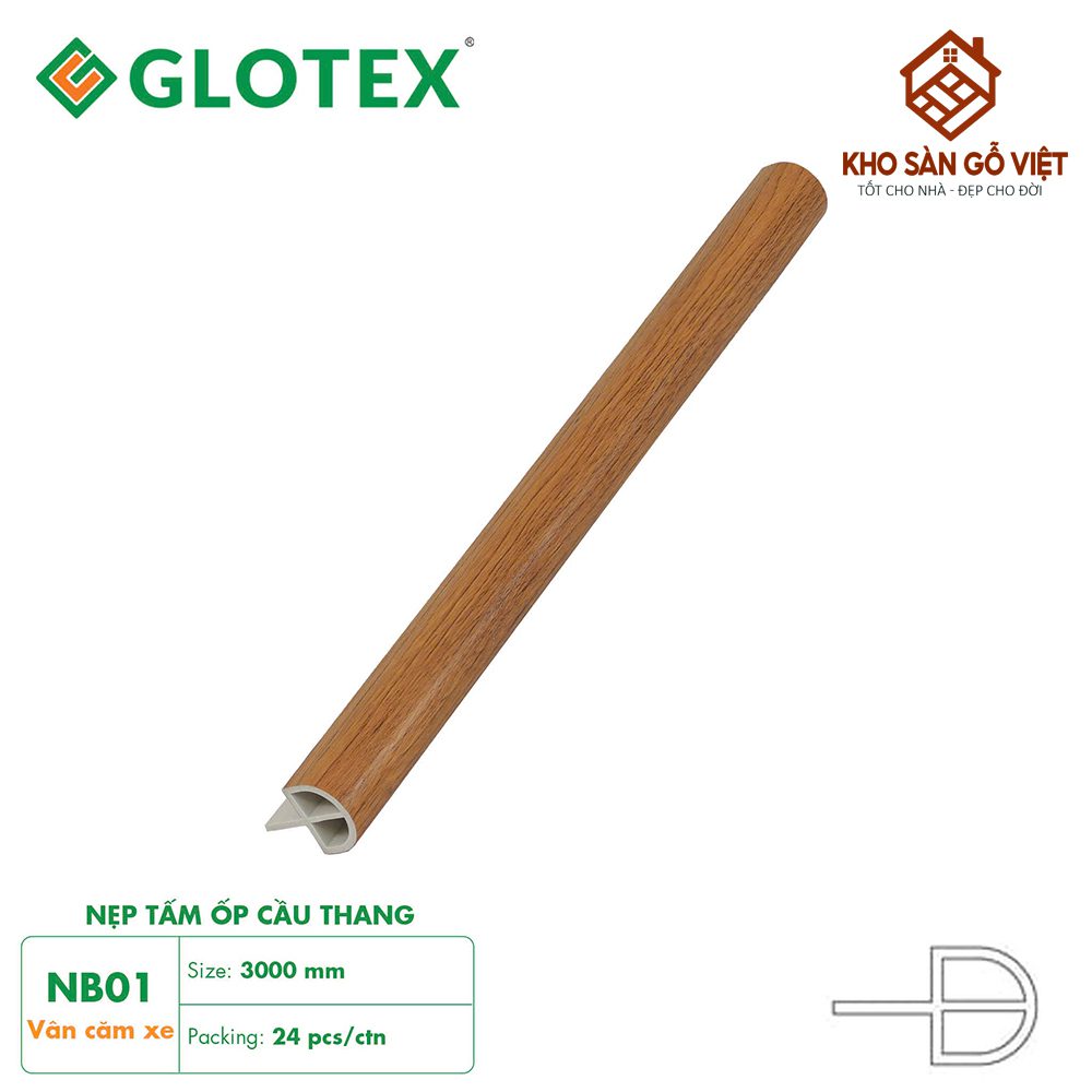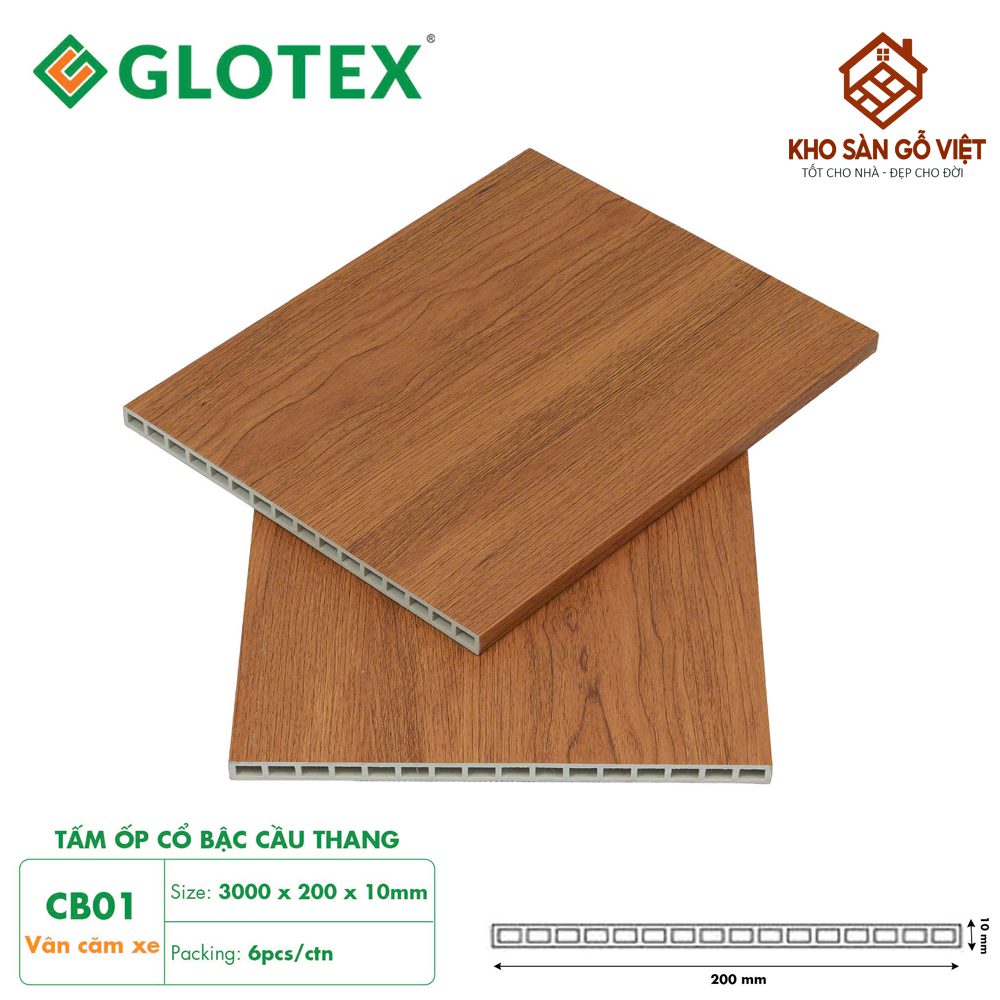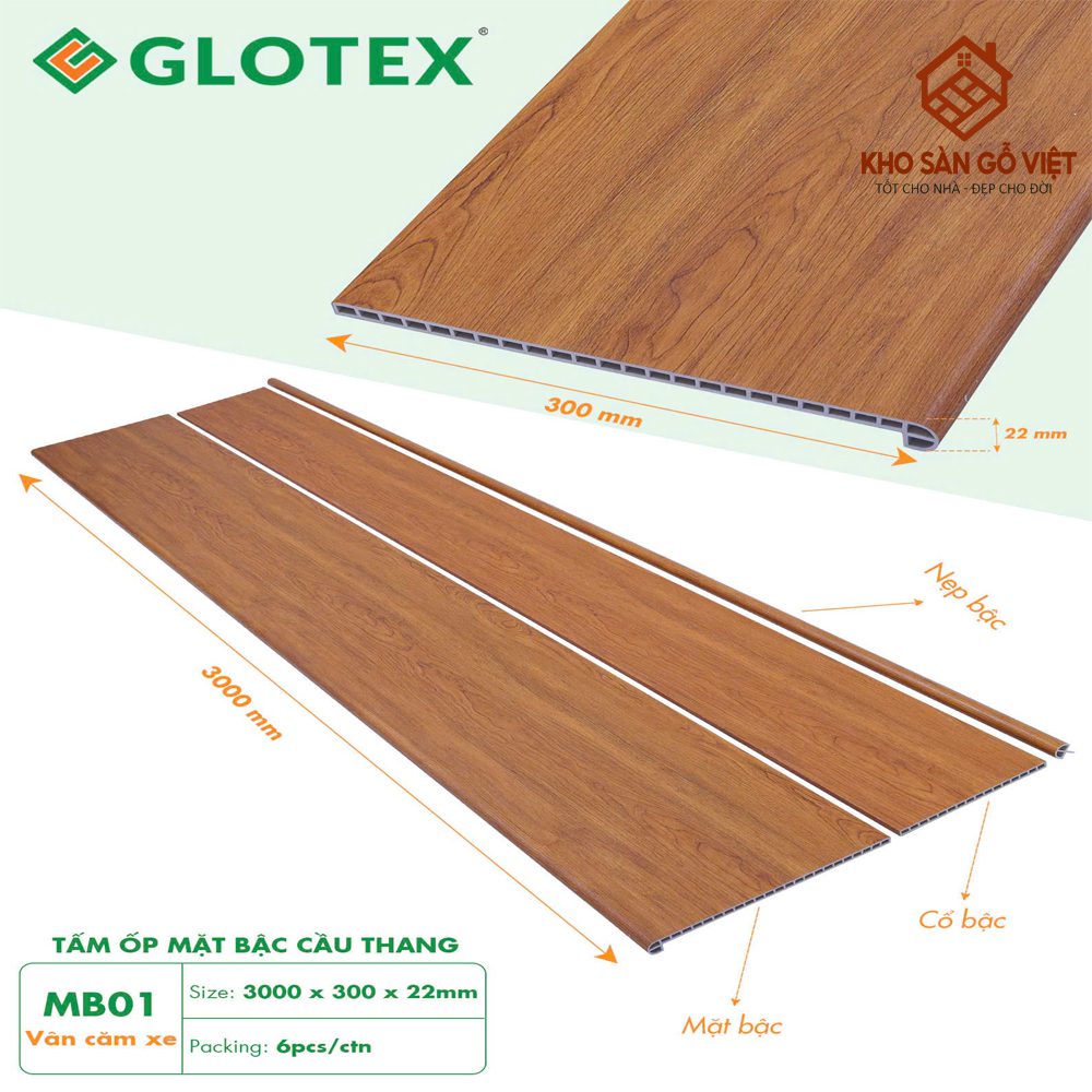 Tấm Ốp Cầu Thang Glotex MB01 là dòng vật liệu ốp trang trí cao cấp mang tông vân căm xe nâu vàng ấm áp, đem đến vẻ đẹp sang trọng và gần gũi cho không gian nội thất. Với kích thước tiêu chuẩn 3000 x 300 x 22mm, sản phẩm gồm ba phần mặt bậc, cổ bậc và nẹp bậc, giúp cầu thang liền mạch và tinh tế hơn. Được sản xuất bằng công nghệ hiện đại của Glotex, MB01 có khả năng chống ẩm, chống mối mọt, chịu va đập tốt và giữ màu bền bỉ theo thời gian. Đây là lựa chọn hoàn hảo cho những công trình yêu cầu tính thẩm mỹ cao như nhà phố, biệt thự, văn phòng hoặc khách sạn.
